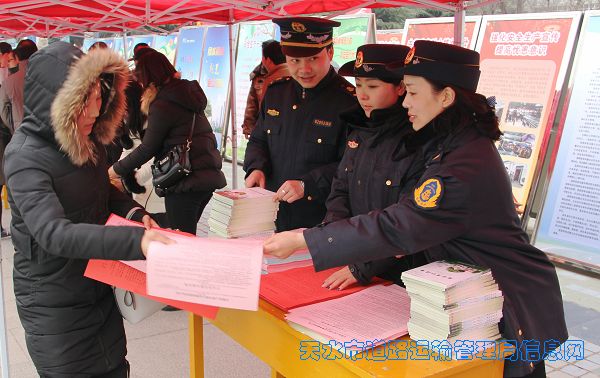 12月1日在天水龙城广场集中开展《安全生产法》咨询日活动,发放了《安全生产法》、《中华人民共和国道路运输条例》、“道路旅客运输安全常识”、“天水市运管局温馨提示-珍惜生命安全,出行拒绝黑车”等安全生产相关的法律法规彩页700余份,现场解答与群众安全出行息息相关的安全生活小常识。