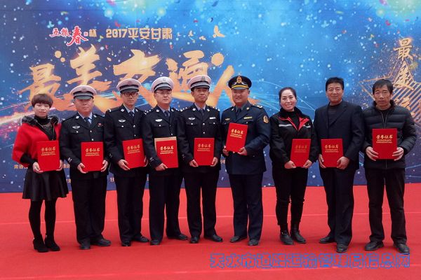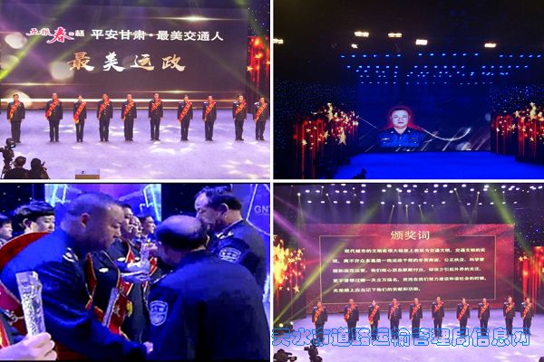 12月2日下午3时,2017年“平安甘肃·最美交通人”颁奖典礼在甘肃广电总台演播大厅隆重举行,现场揭晓并颁发了“平安甘肃·最美交警”、“平安甘肃·最美运政”、“平安甘肃·最美司机”、“平安甘肃·最美交通协管员”、“平安甘肃·最美交通志愿者”、“平安甘肃·最美农村交通安全劝导员”六大奖项。天水市推选的46名候选人中共有9人获奖,其中5人获此殊荣、4人获提名奖。
